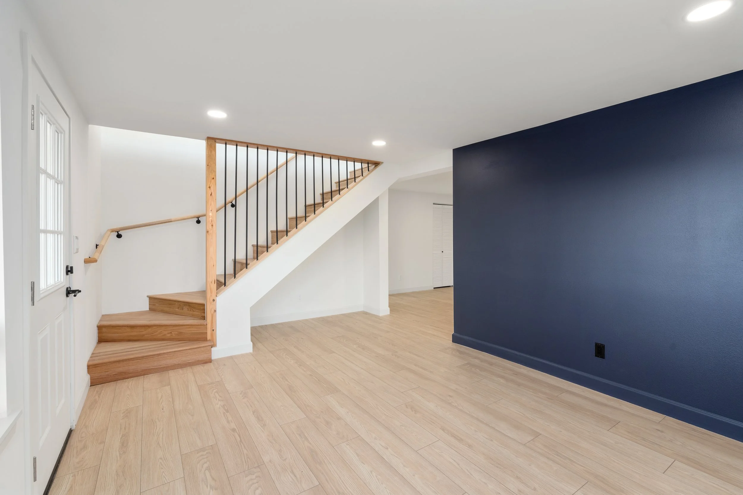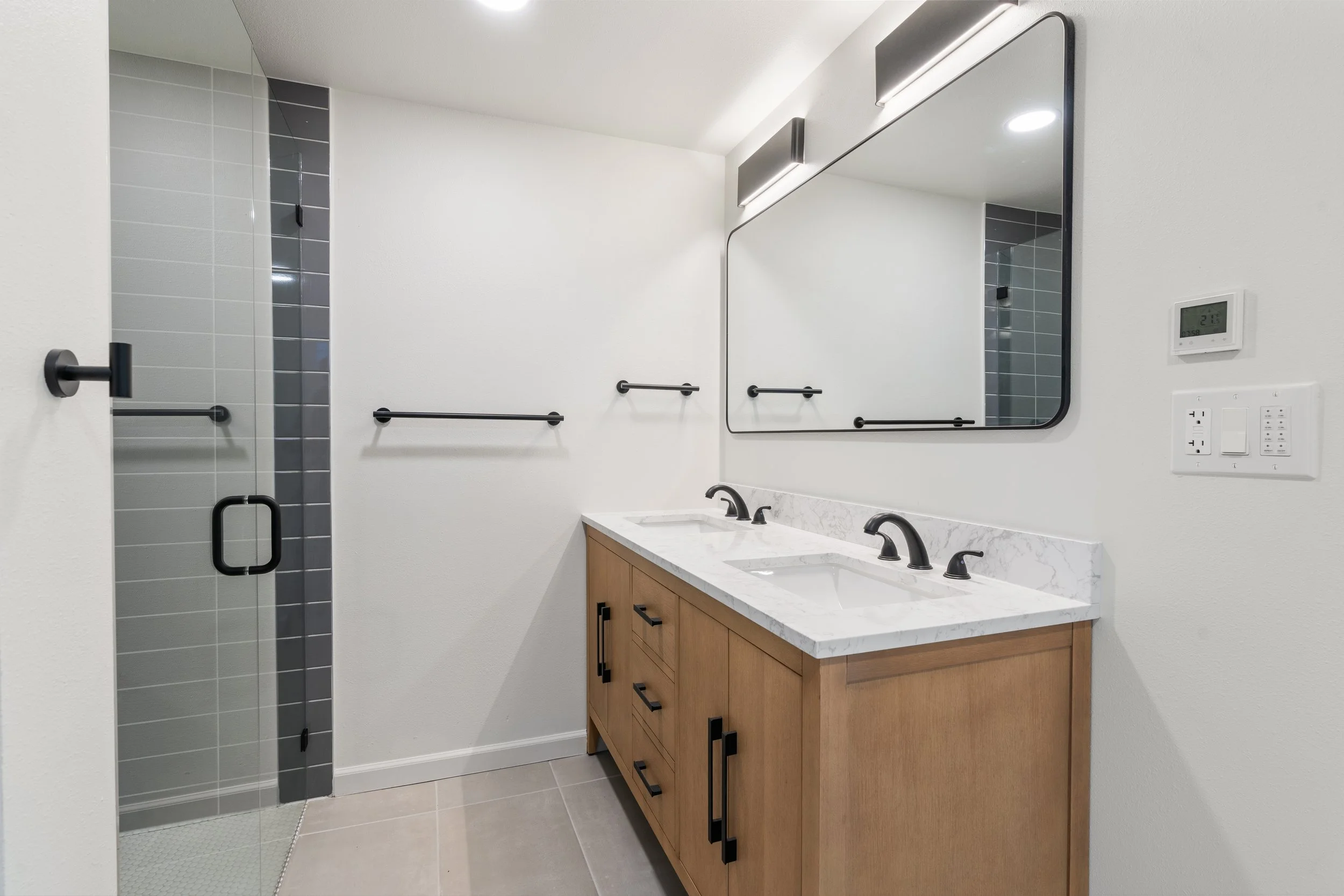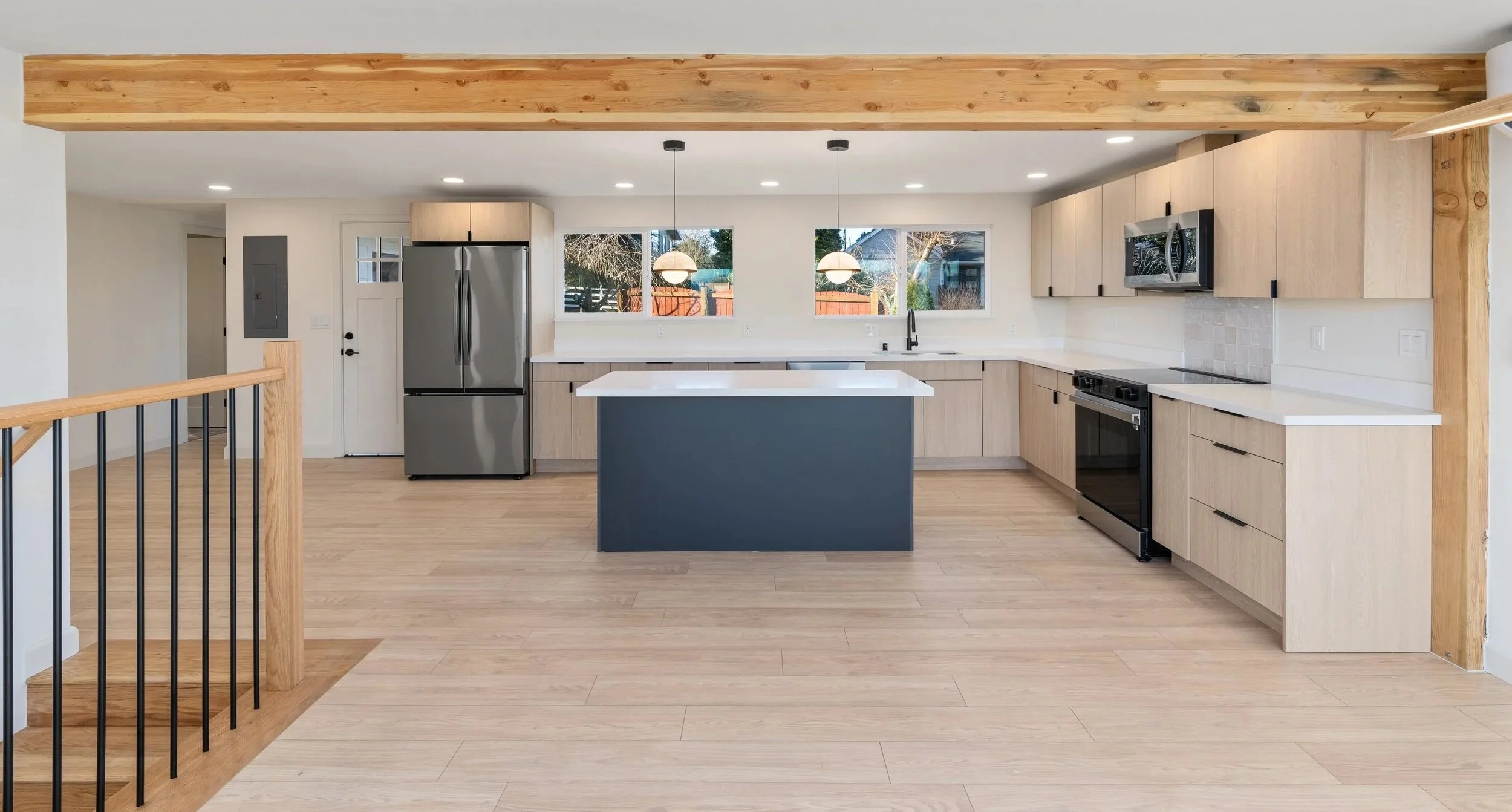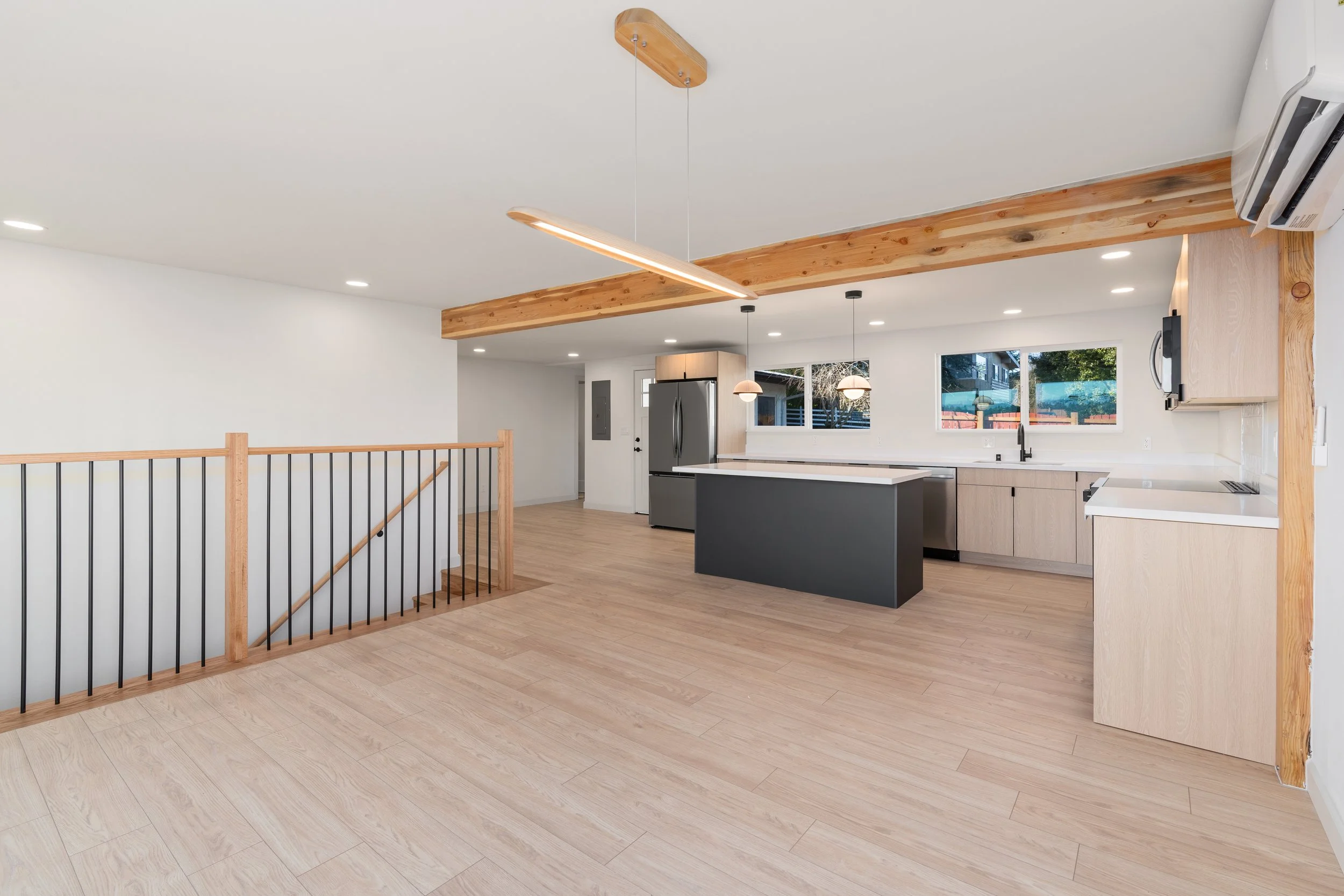 To reflect the Nordic design, we installed light blonde wood flooring, handrails, vanities, and kitchen cabinetry. A structural beam was intentionally left exposed. The monochromatic palette is further reinforced with matte black fixtures in both the bathrooms and kitchen.