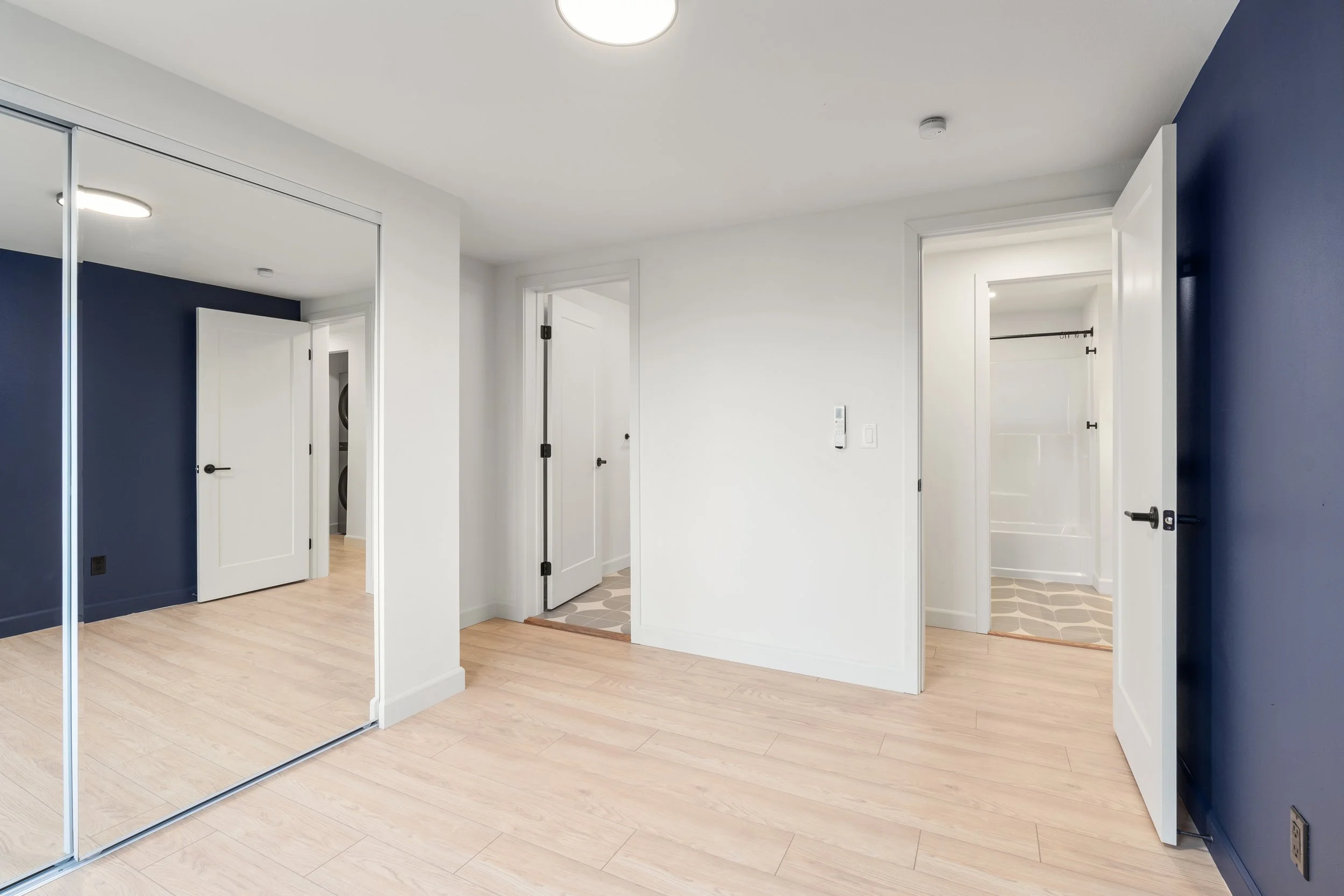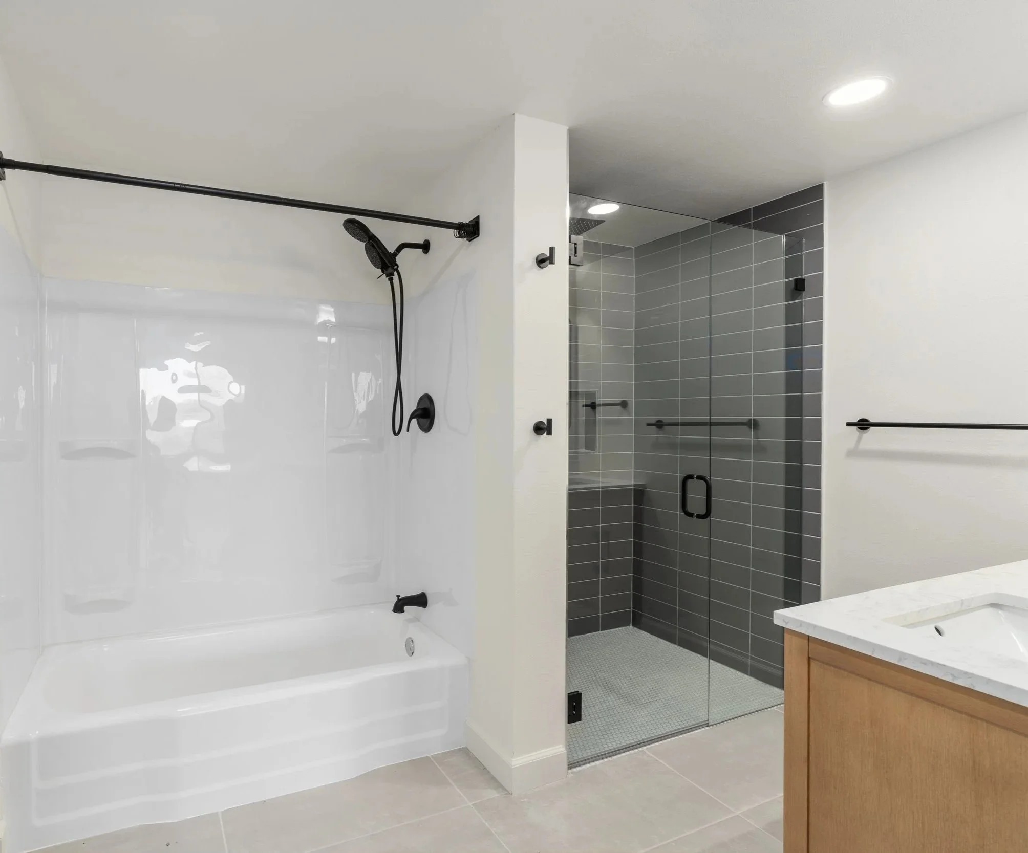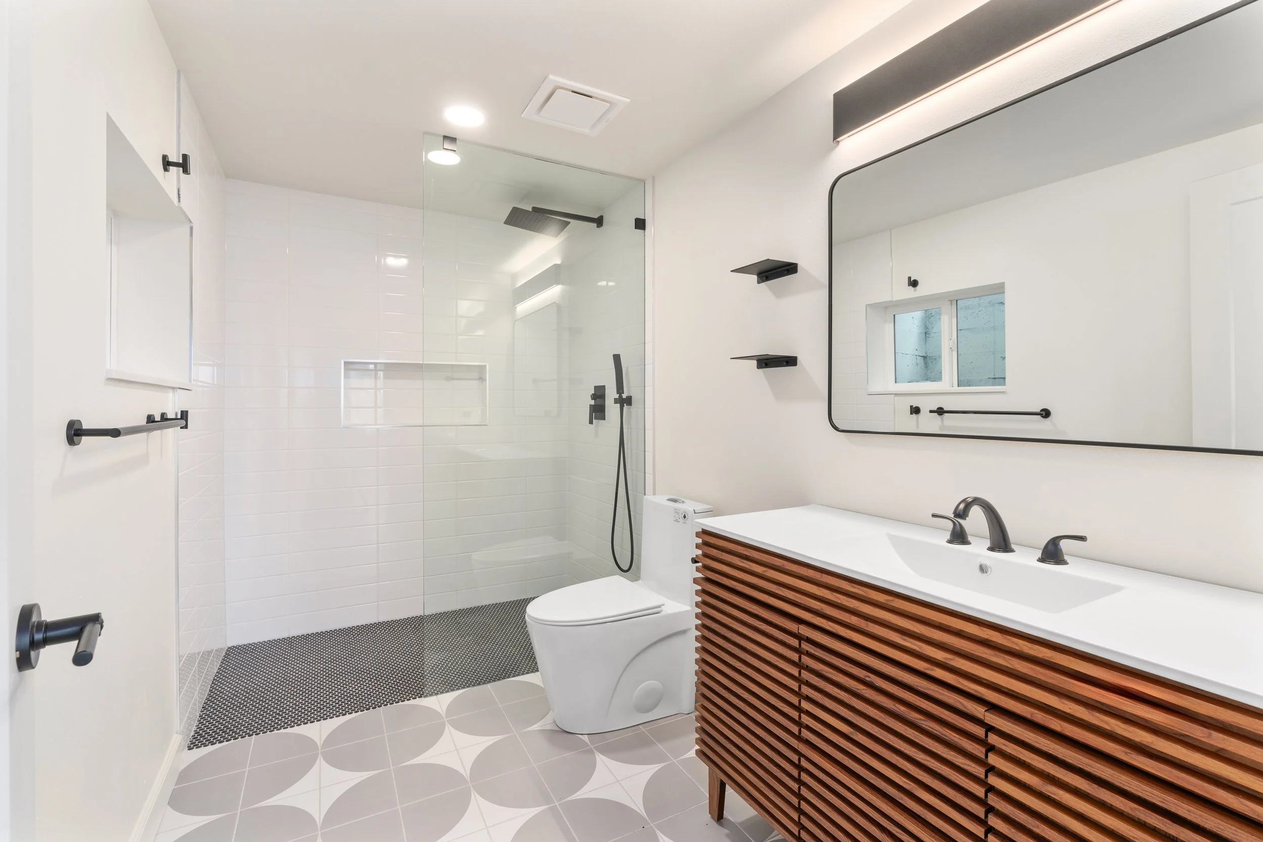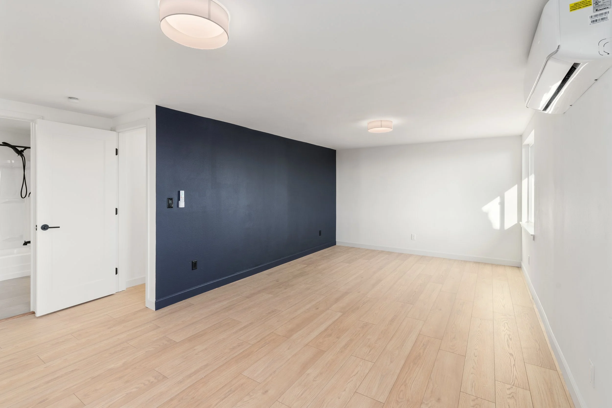 To reflect the Nordic design, we installed light blonde wood flooring, handrails, vanities, and kitchen cabinetry. A structural beam was intentionally left exposed. The monochromatic palette is further reinforced with matte black fixtures in both the bathrooms and kitchen.
