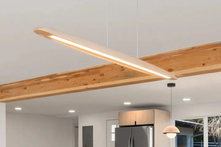 To celebrate the home’s aviation connection, the kitchen island pendants and the dining space chandelier were selected for their visual resemblance to airplane components.