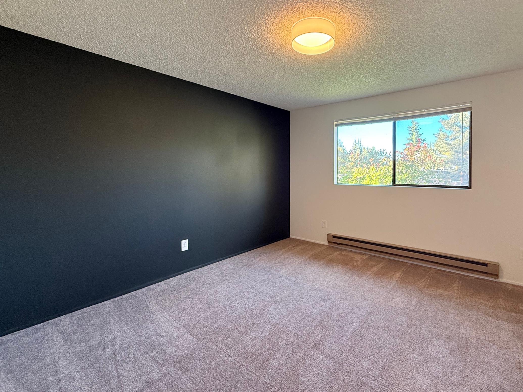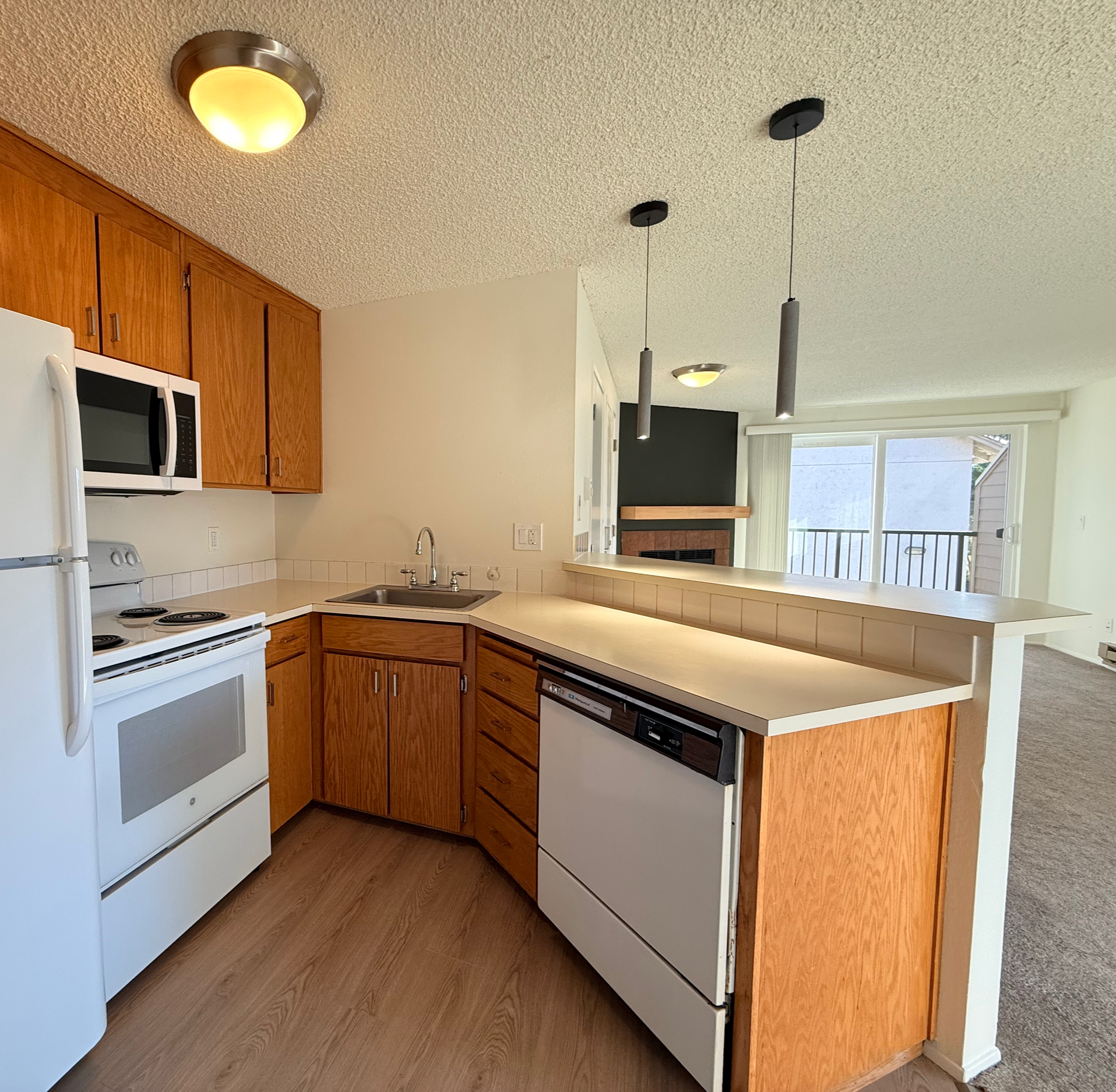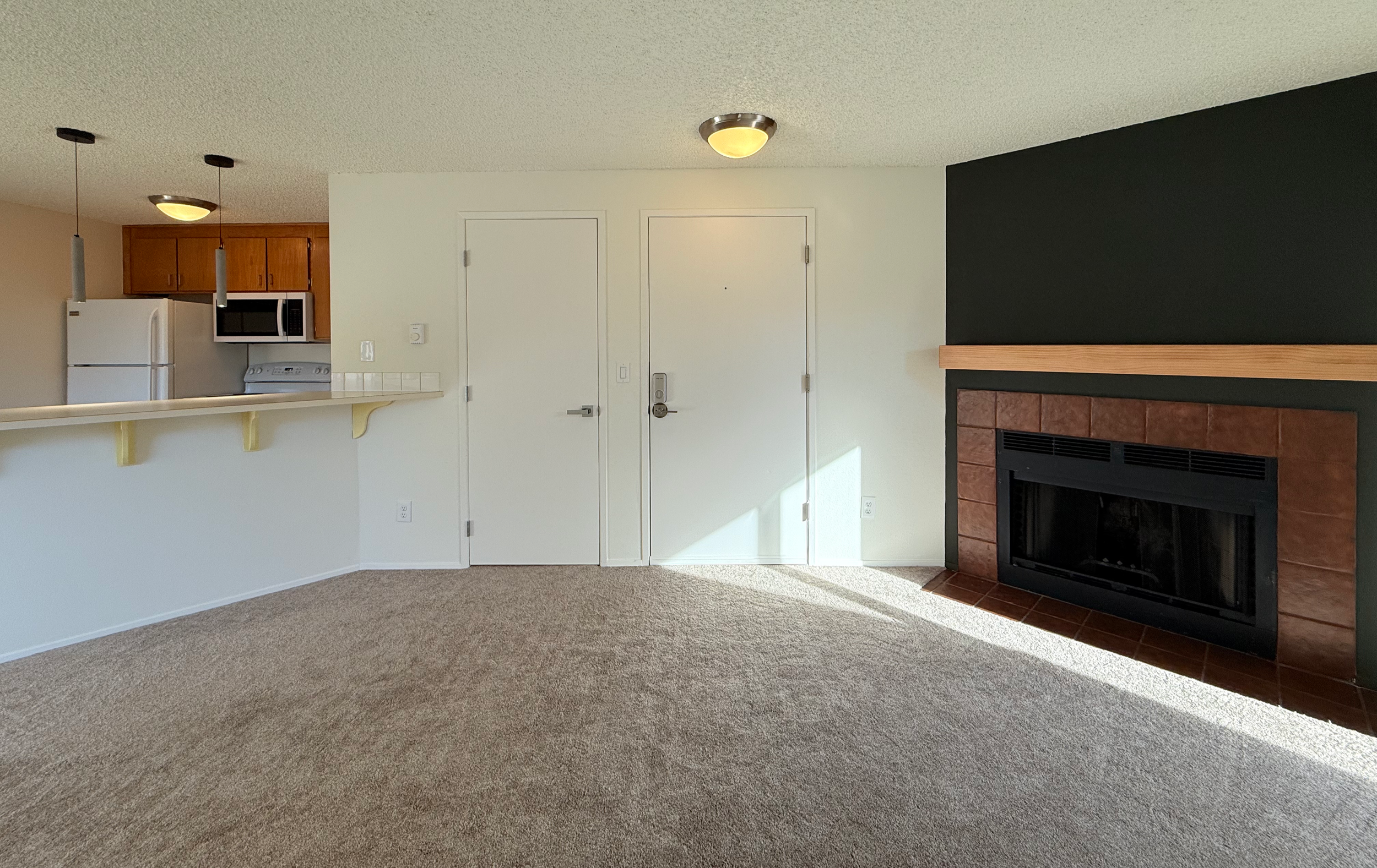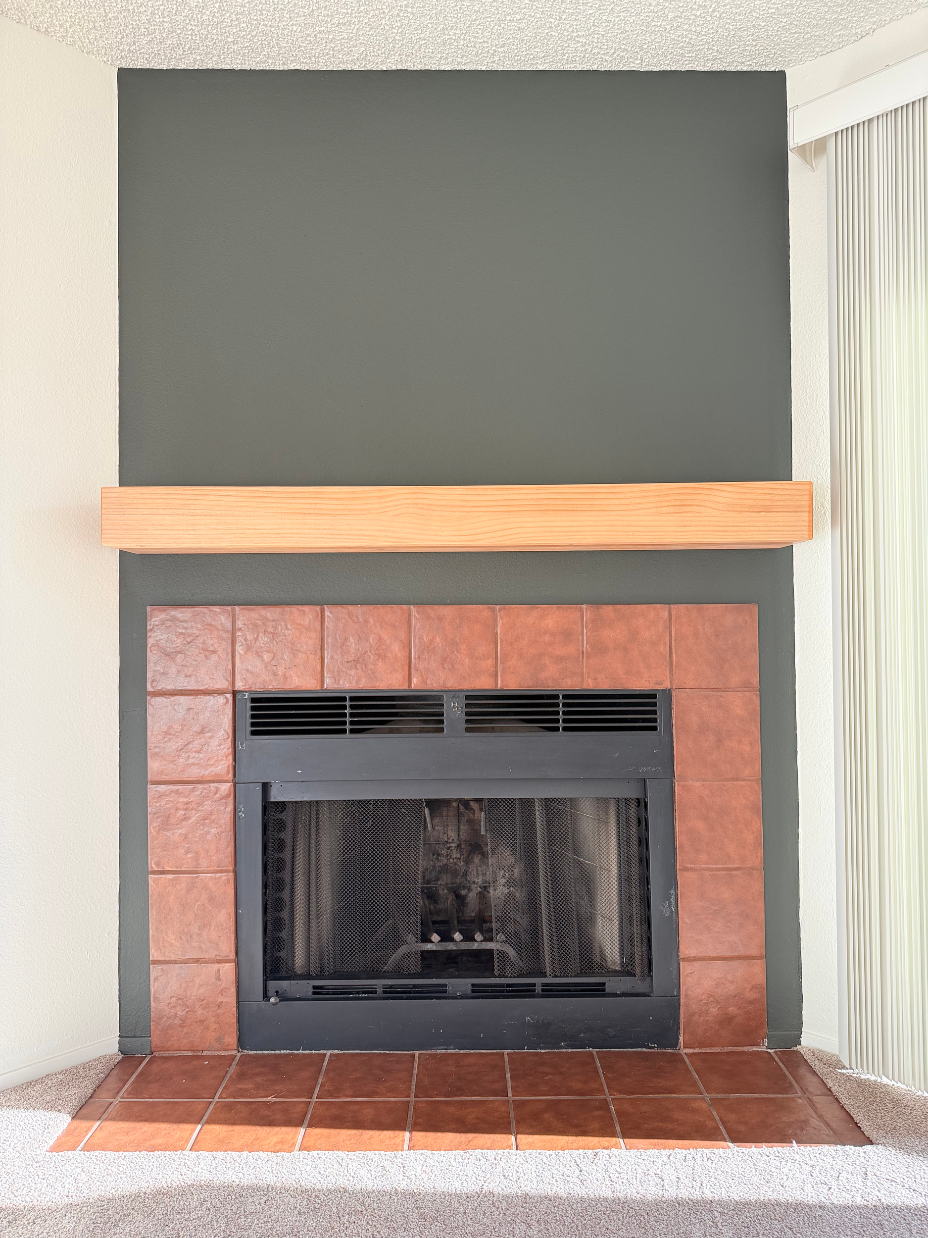 This one-bedroom, one-bath condo was built in the 1980s and came with original cabinets and countertops that were still in excellent condition. The owners wanted to preserve these elements while revitalizing the unit to become an appealing rental. The fireplace was another strong visual feature that had to remain, as removal was not permitted by the Association.