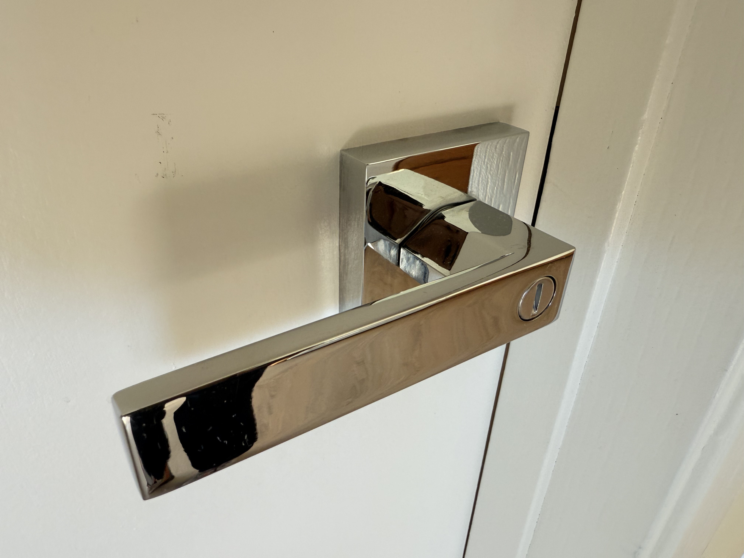 Metal fixtures, including the vanity faucet and door levers, were selected for their sleek lines and slightly industrial feel, complementing the condo’s transitional ’80s character.