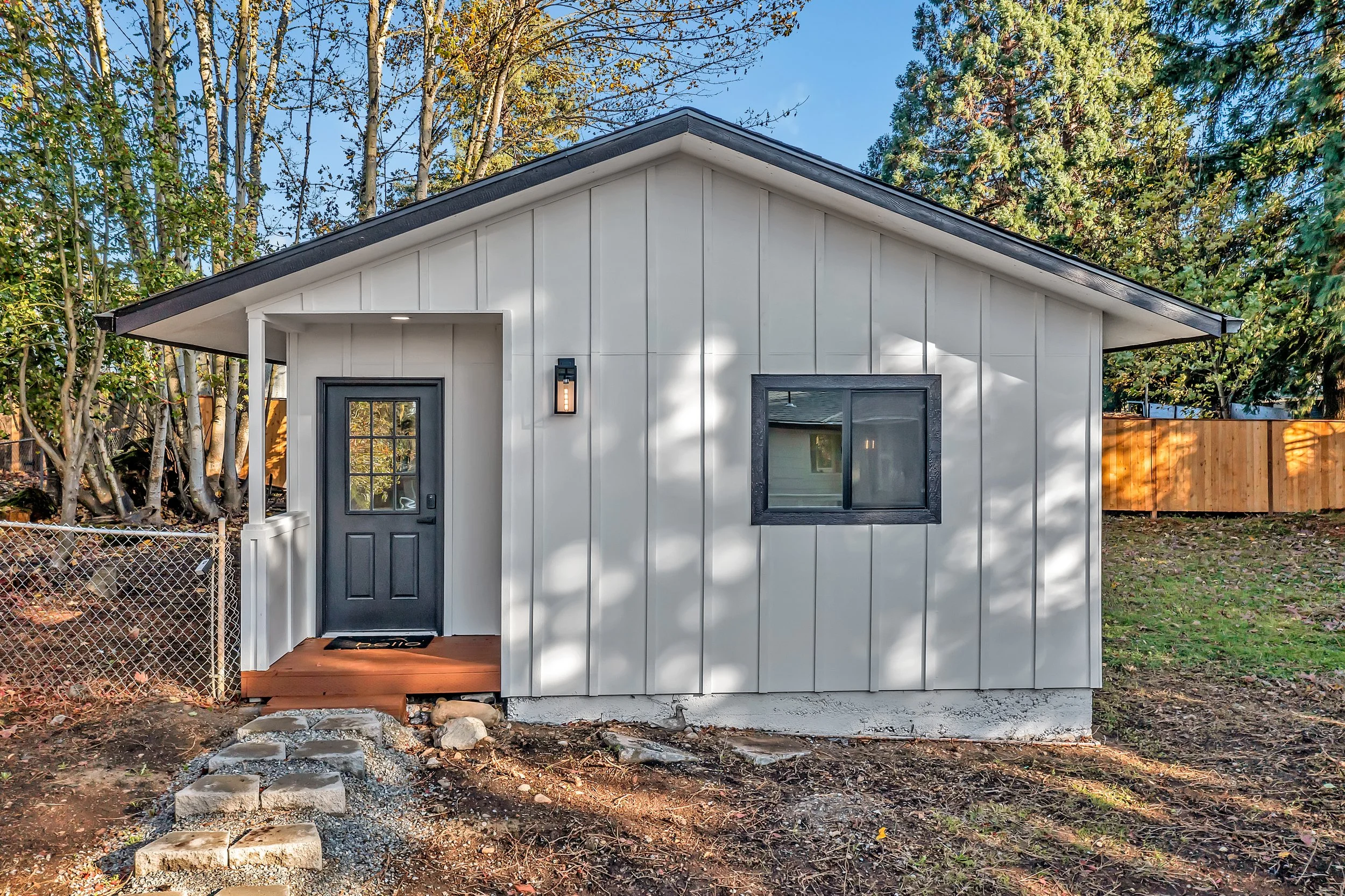 Since the cottage was built at a later time than the main house, a board-and-batten siding design was chosen to give it a more modern identity, while maintaining cohesion through a shared paint color.