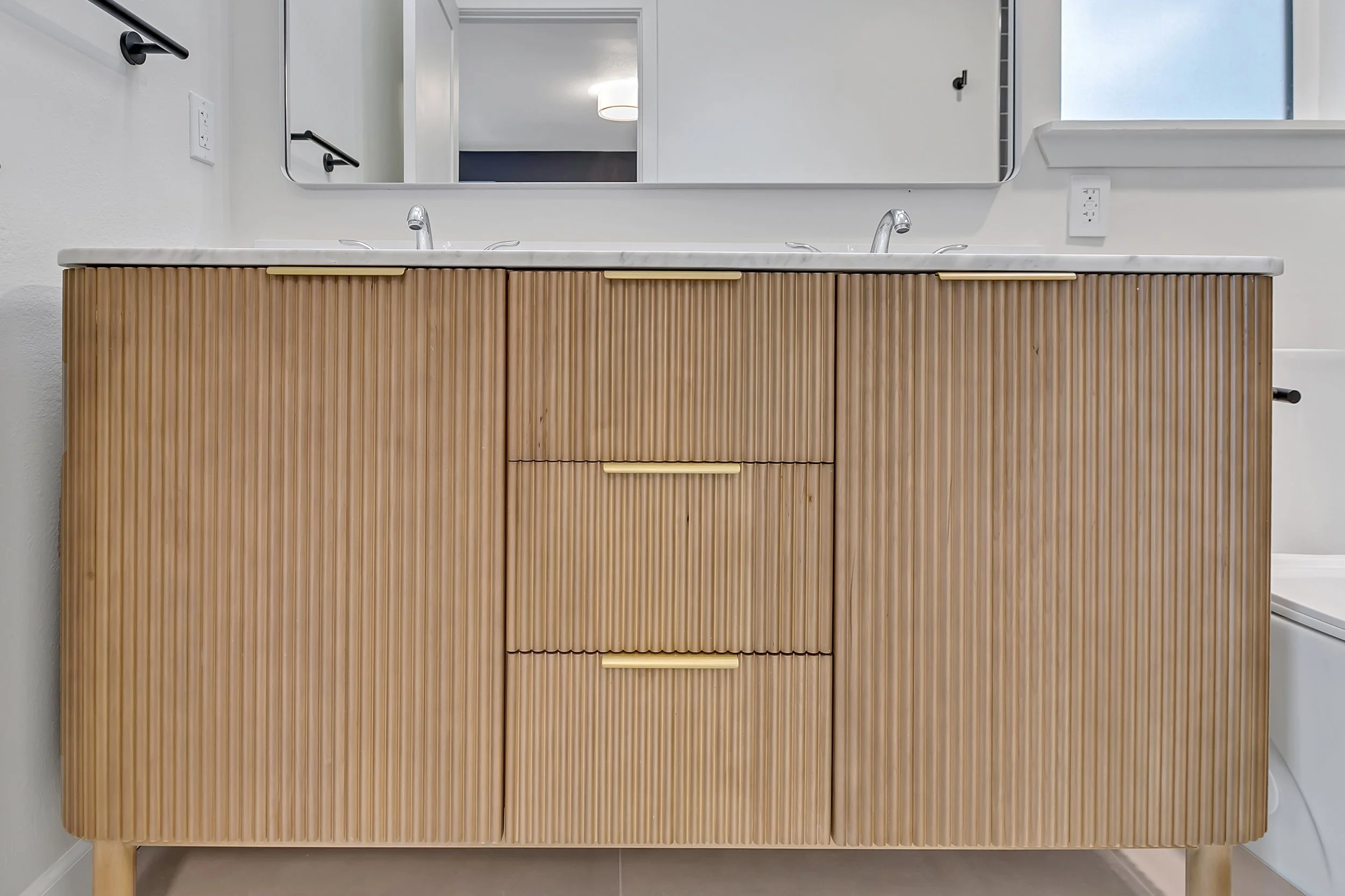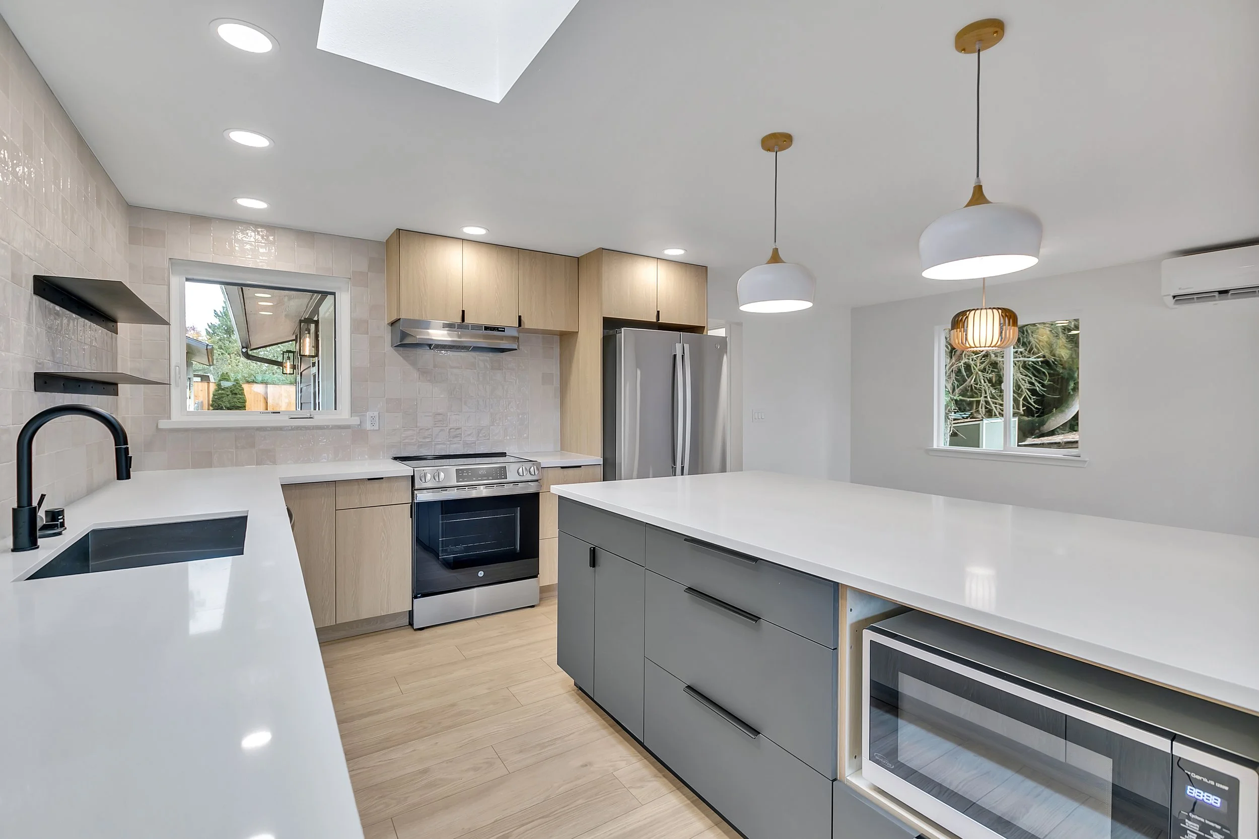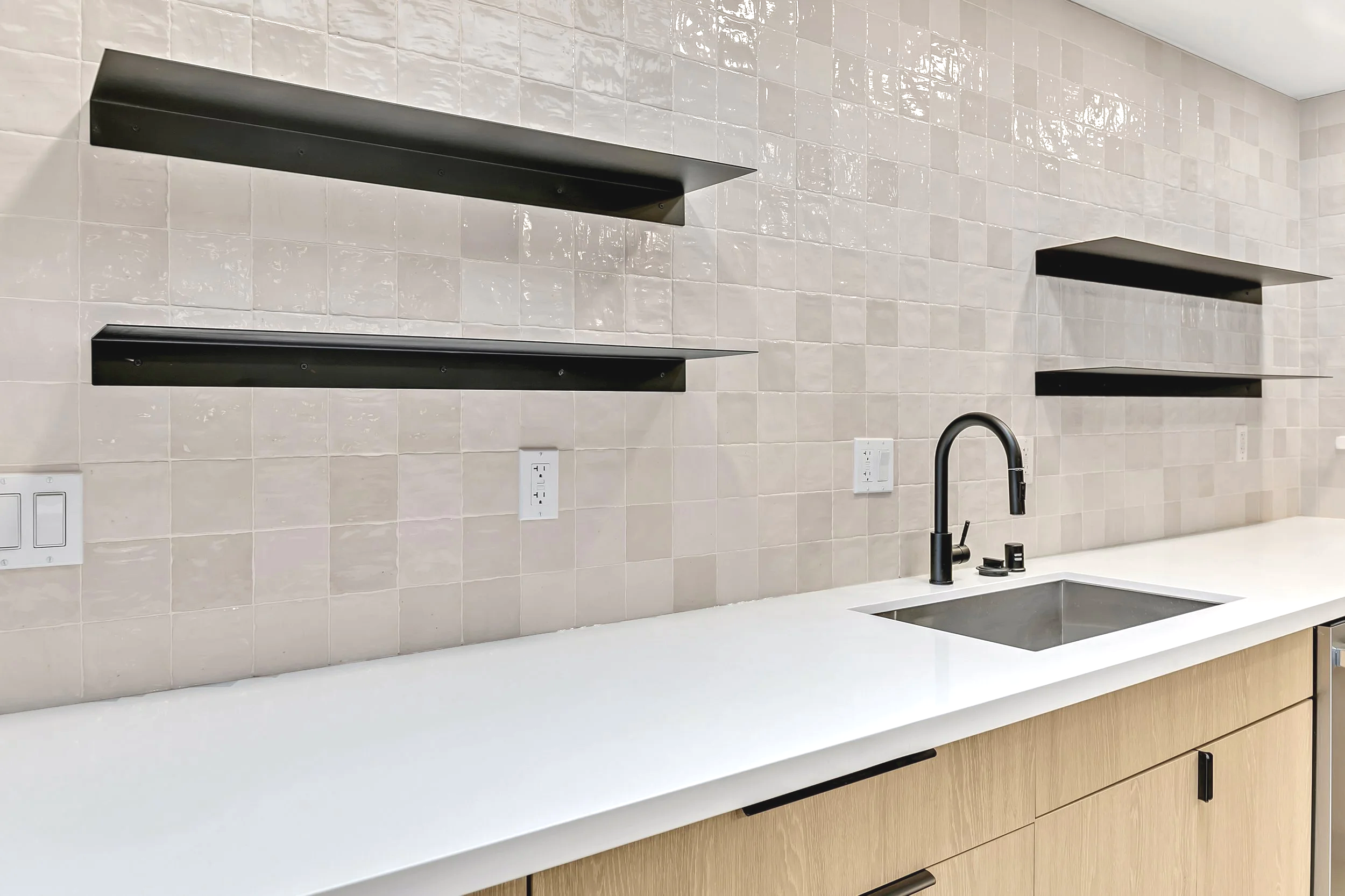 In the kitchen, handcrafted Zellige tiles were selected for the full-wall backsplash to introduce a natural material that balances the clean, modern lines of the cabinetry with organic texture and variation. Upper cabinets were intentionally omitted, as storage was already sufficient and the open design helps maintain an airy, spacious feel.