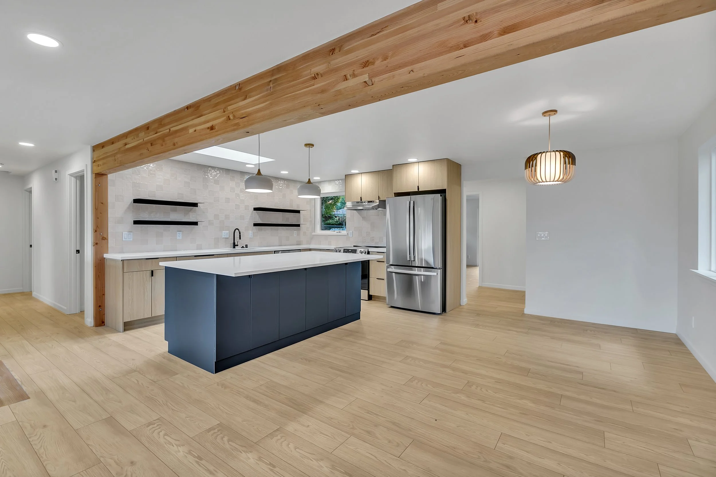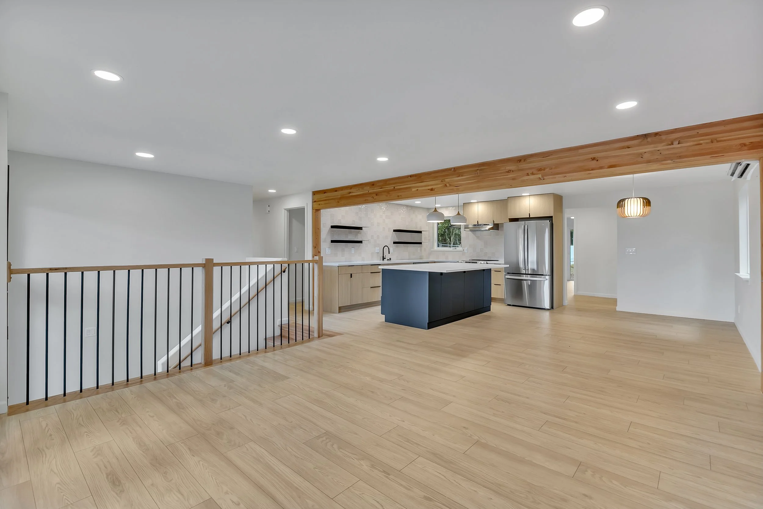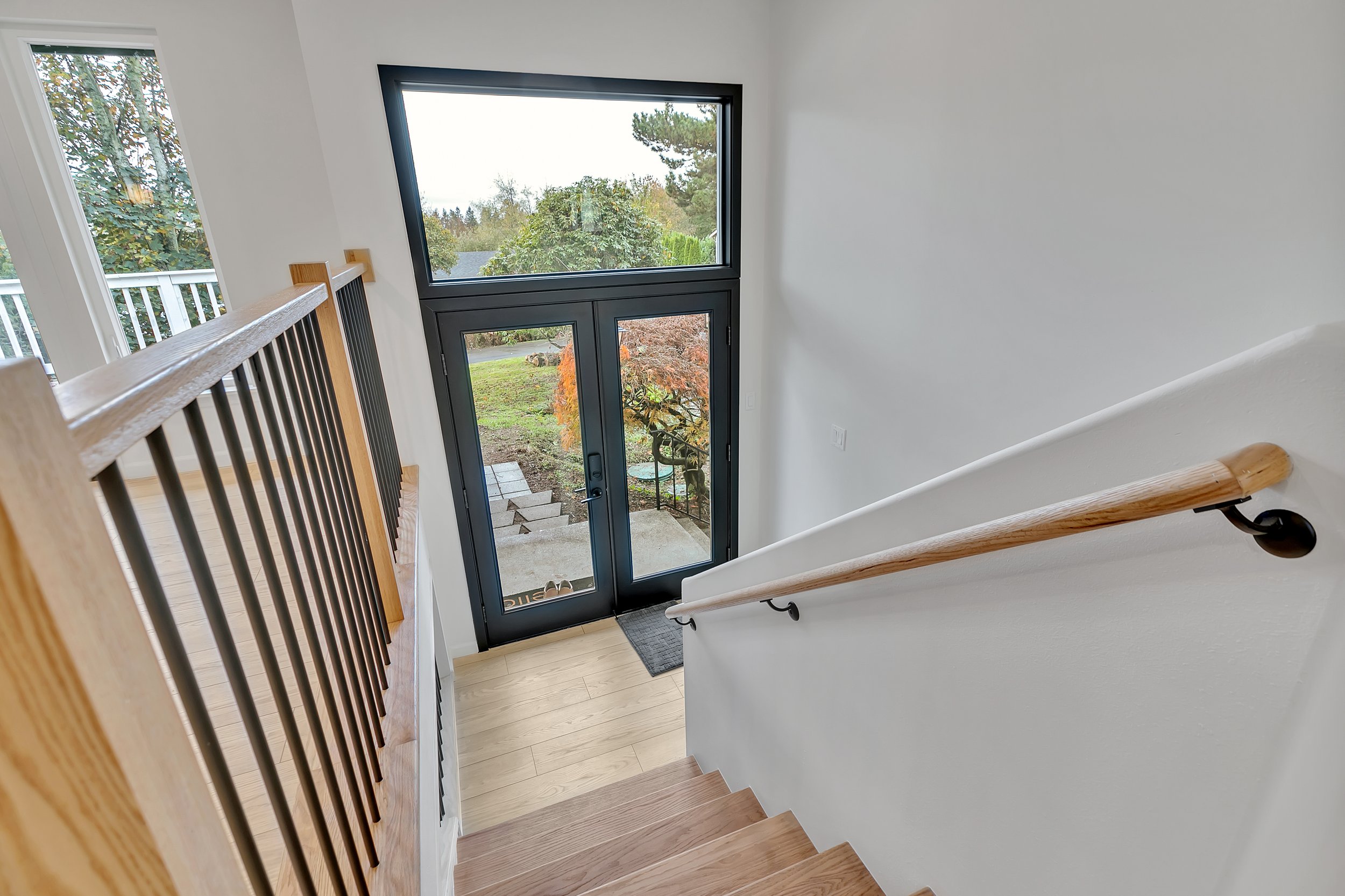 One challenge of the split-level design (popular in the Seattle area during the 1960s and 1970s), is the main entry which opens directly into the middle of the staircase! To improve the experience of entering the house, we rebuilt the staircase to have rounded corners on all handrail surfaces, making it feel more welcoming and comfortable to move through.