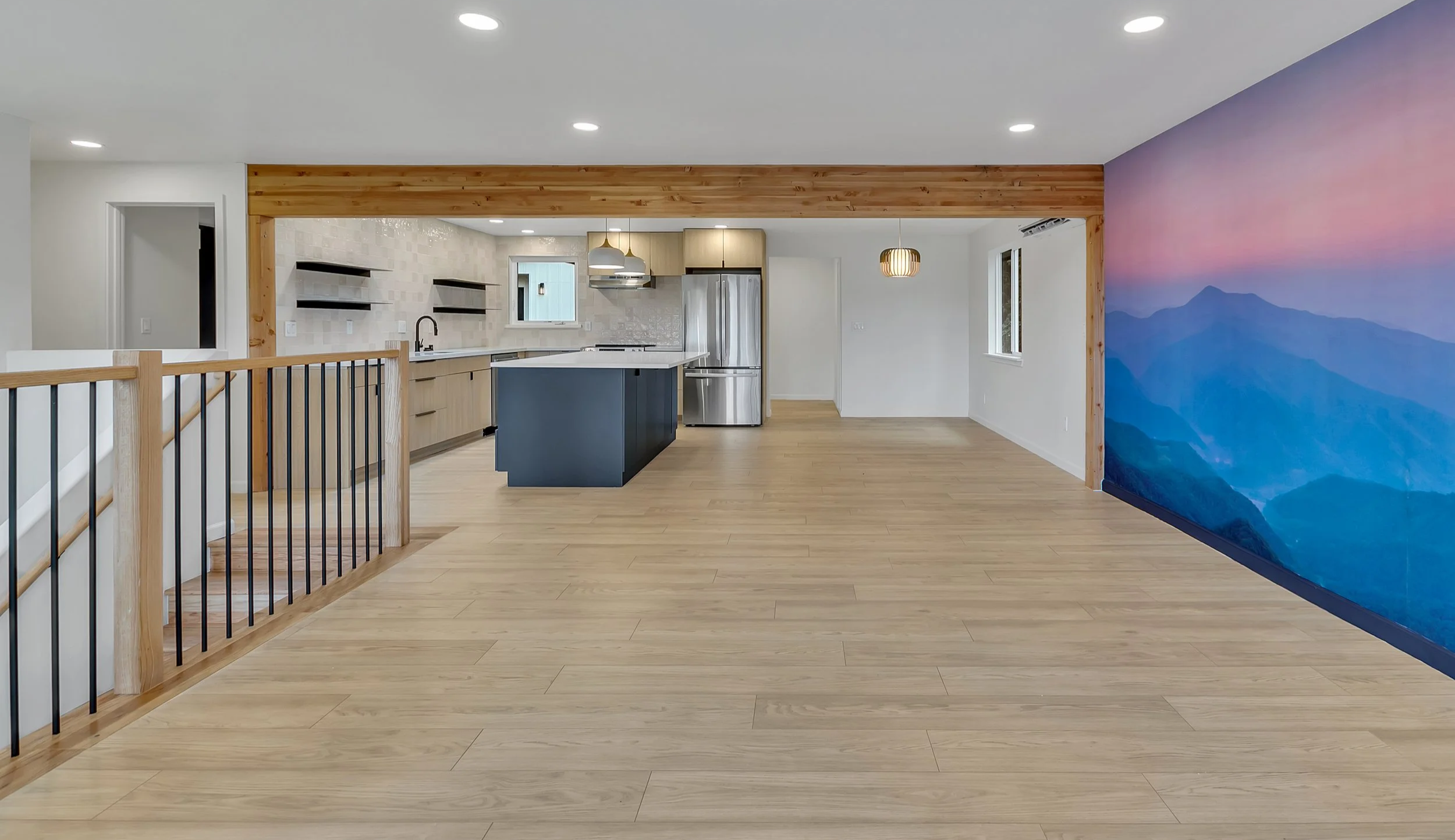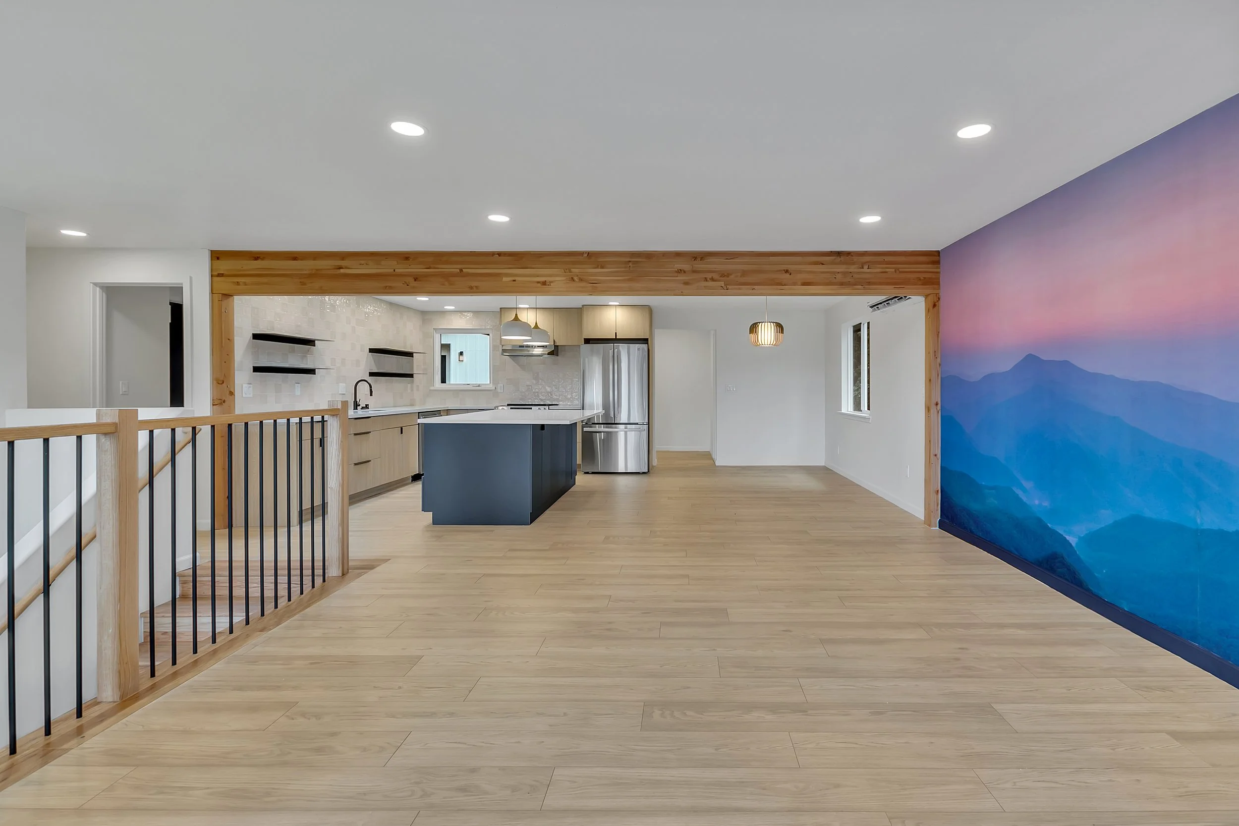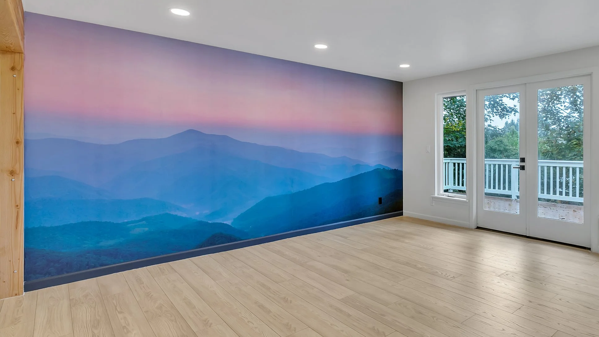 A full-wall wallpaper featuring a mountain range at sunrise was installed in the living room. This element brings color and playfulness into the main living space, with hues that tie seamlessly into the accent colors used in the bedrooms.