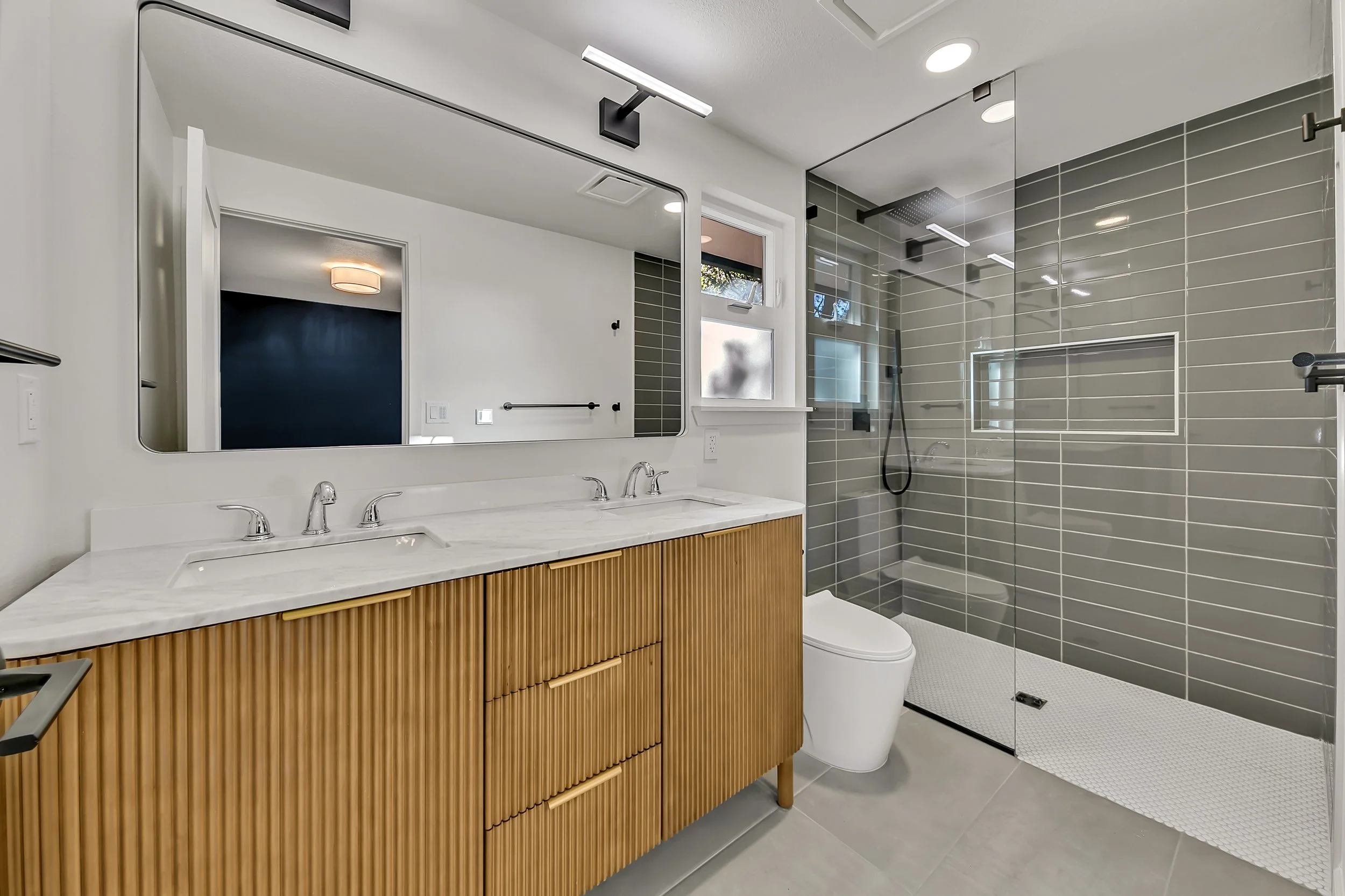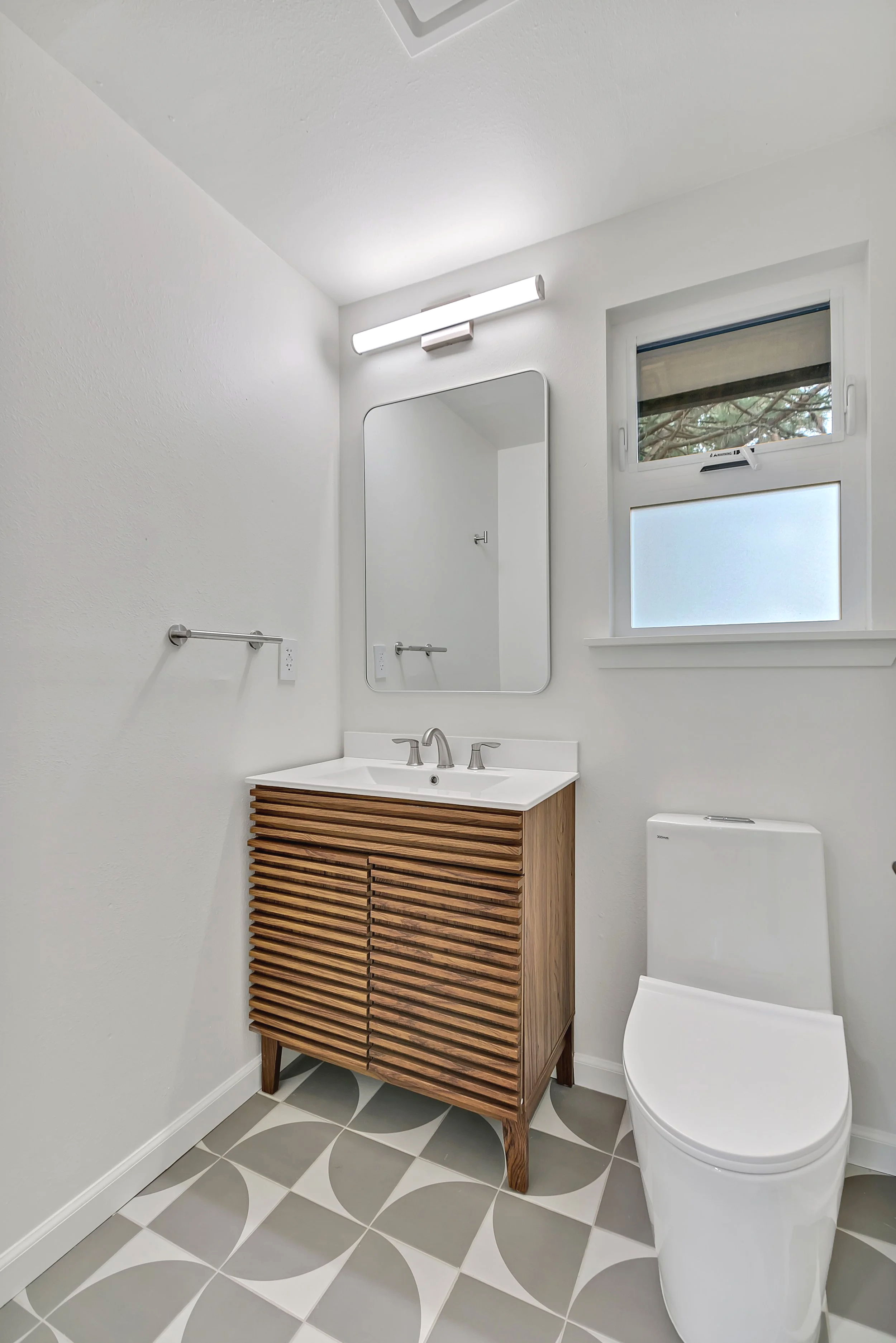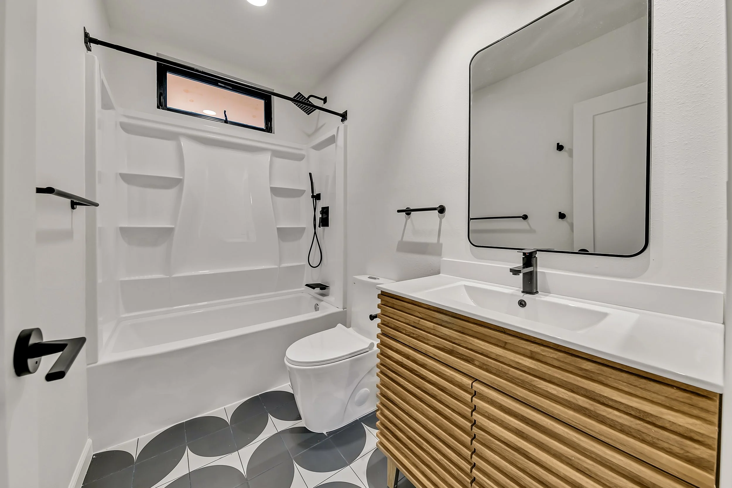 To support the home’s total of seven bedrooms, a total of four full bathrooms and one powder room were completed. In each of the bathrooms (except the primary), the same floor tile was used but laid in three different patterns and with two different colors. This approach allows the bathrooms to feel fresh and modern while remaining cohesive with each other.